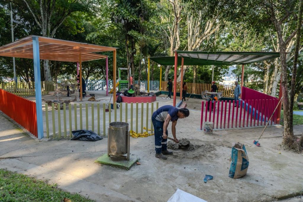 Las labores incluyen un nuevo parque infantil, mantenimiento al gimnasio biosaludable, construcción de senderos rústicos, instalación de columpios para niños y mesas de juego, acciones que se complementan con podas, pintura y embellecimiento general del parque.